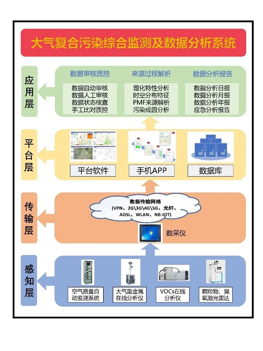 整套系统由感知层、传输层、平台层、应用层组成,可实现空气中无机气体、VOCs、元素成分、阴阳离子、黑碳、太阳辐射等因子的监测,通过这些监测结果对空气污染物的化学组成、光学性质等进行监测与解析。该系统24小时全天候自动运行,对大气环境质量进行实时监测。同时通过数据分析系统,对大气复合污染进行动态分析。