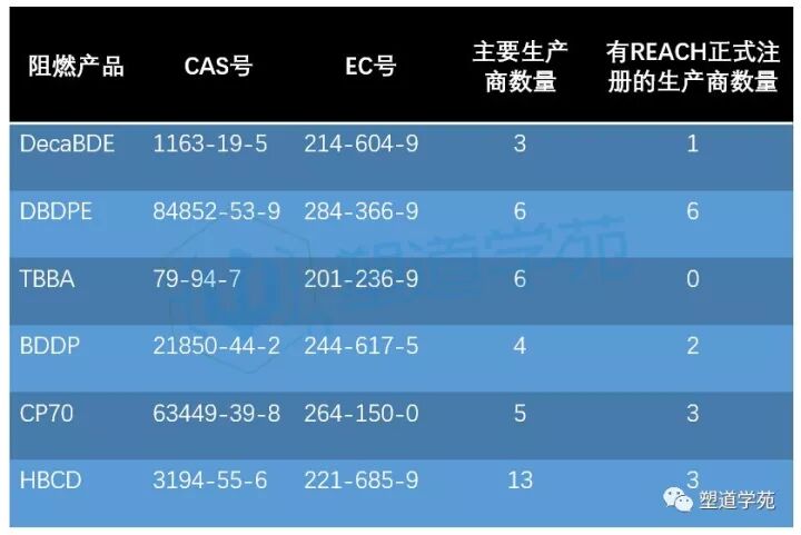 目前,大多数中国化工企业都积极应对REACH注册,已有超过80%的主要阻燃产品完成了REACH正式注册。下表给出了当前国内主要的溴系阻燃剂产品、生产商数量以及REACH注册情况。