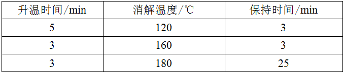各称取0.1g土壤及水系沉积物标样(至0.0001g)至聚四氟乙烯微波消解罐中,加少量的超纯水润湿后,加入9mL硝酸和3mL盐酸。预反应20分钟后,加盖拧紧消解罐,同时做样品空白。按照表1的升温程序进行消解,待消解完成后冷却至室温,加入3mL氢氟酸,在电热板上200℃进行飞硅。反应约40min后,再加入1.5mL高氯酸,在赶酸仪上180℃进行赶酸处理,直至白烟,内溶物呈不流动状态,取下稍冷,用少量硝酸冲洗消解罐内壁,利用余温溶解附在消解罐内壁的残渣。用超纯水清洗消解罐内壁至少三次,将消解液转移至100 mL 容量瓶中,选用铑、铼做内标,同时将样品和样品空白中分别加入10μg/L铑、铼混合内标,用超纯水定容至刻线,摇匀以待分析。